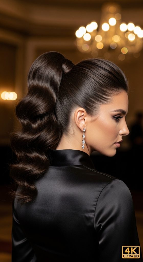 For a modern, red-carpet-inspired bridesmaid look, the high glam voluminous ponytail delivers drama and sophistication. It elongates the face and highlights cheekbones, making it especially flattering in formal weddings.