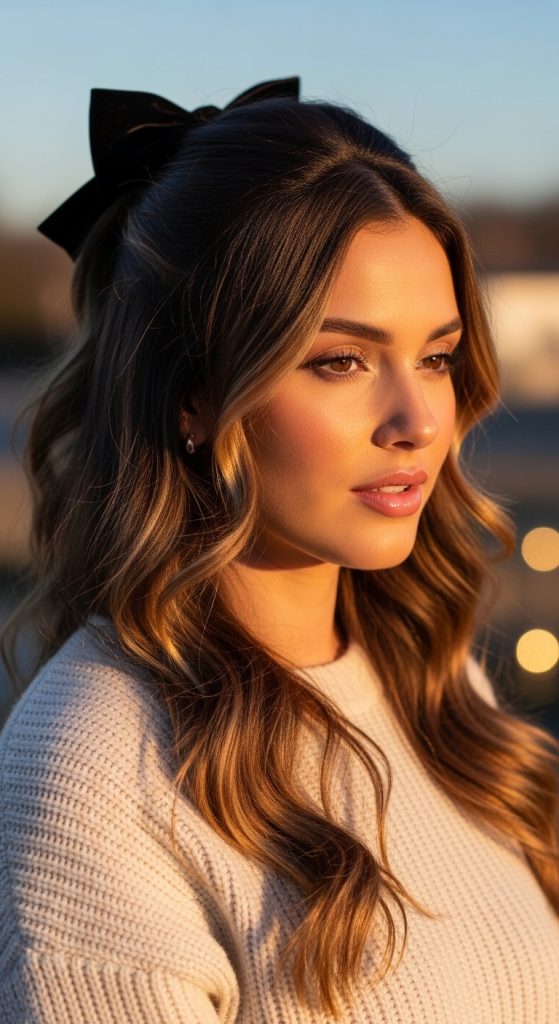 The half-up hairstyle tied with a satin or velvet bow is playful yet polished. It’s feminine, soft, and perfectly aligned with the preppy aesthetic.