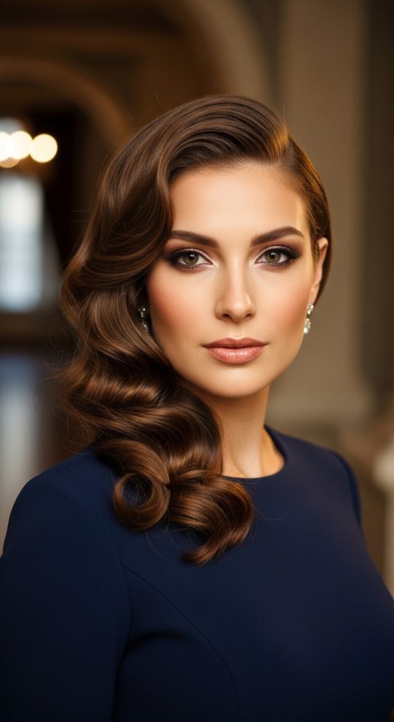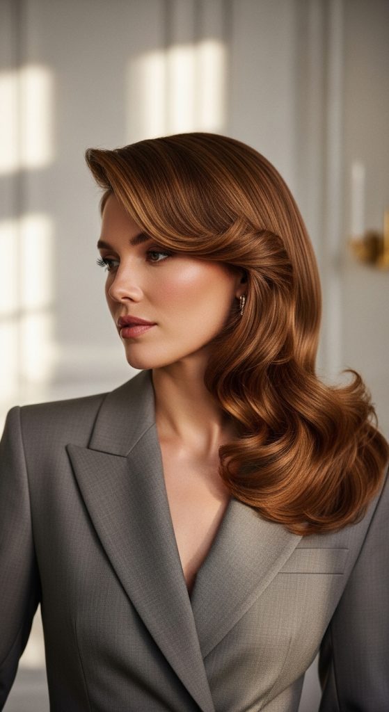 A defined side part with subtle curls feels polished and feminine.