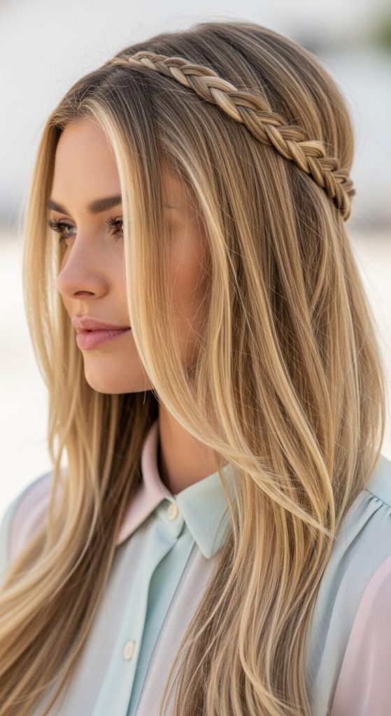 The braided headband uses your own hair to create a subtle crown effect. It’s sweet, structured, and polished.