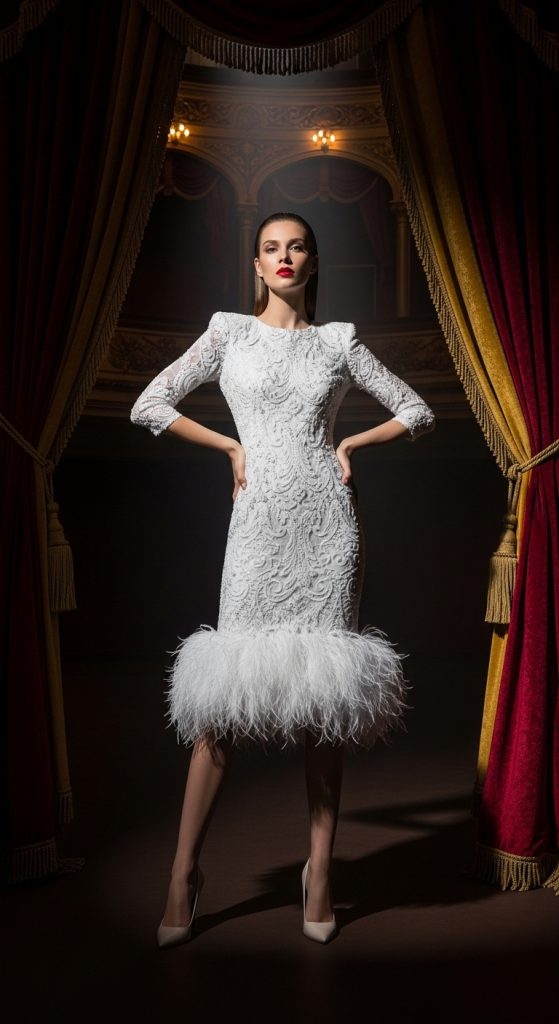 Feather-trimmed sparkle dresses combine texture with shine.