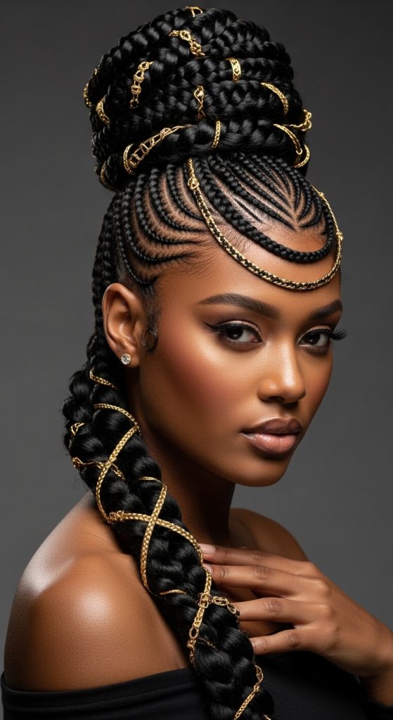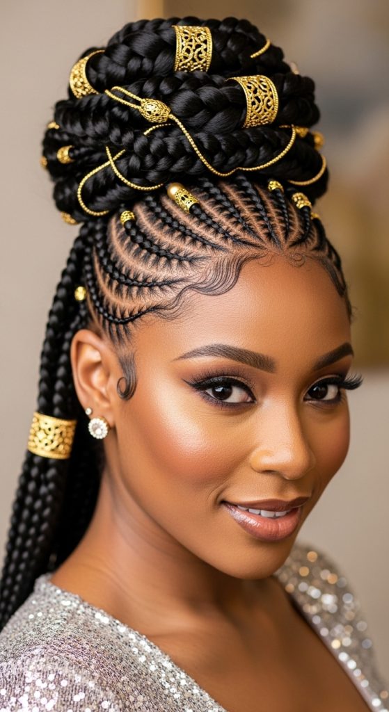 Fulani braids styled into an updo create a detailed and culturally inspired prom hairstyle.