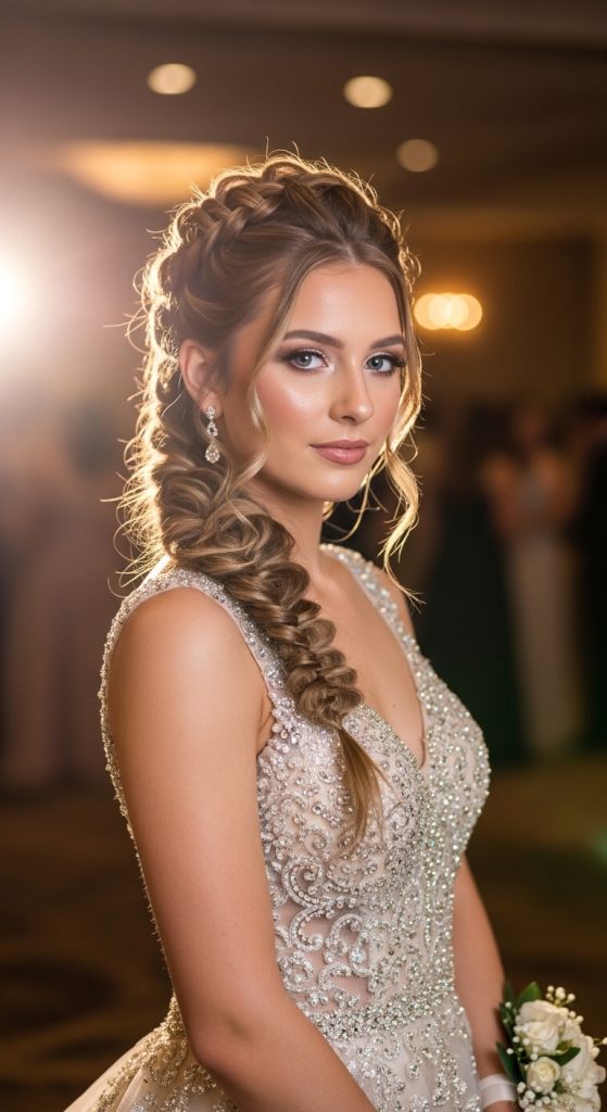 This hairstyle is especially popular for prom because it balances natural beauty with a sophisticated formal style.