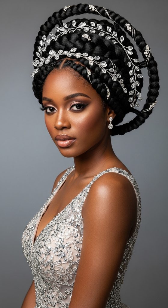 This updo transforms long box braids into a glamorous and sophisticated bun.
