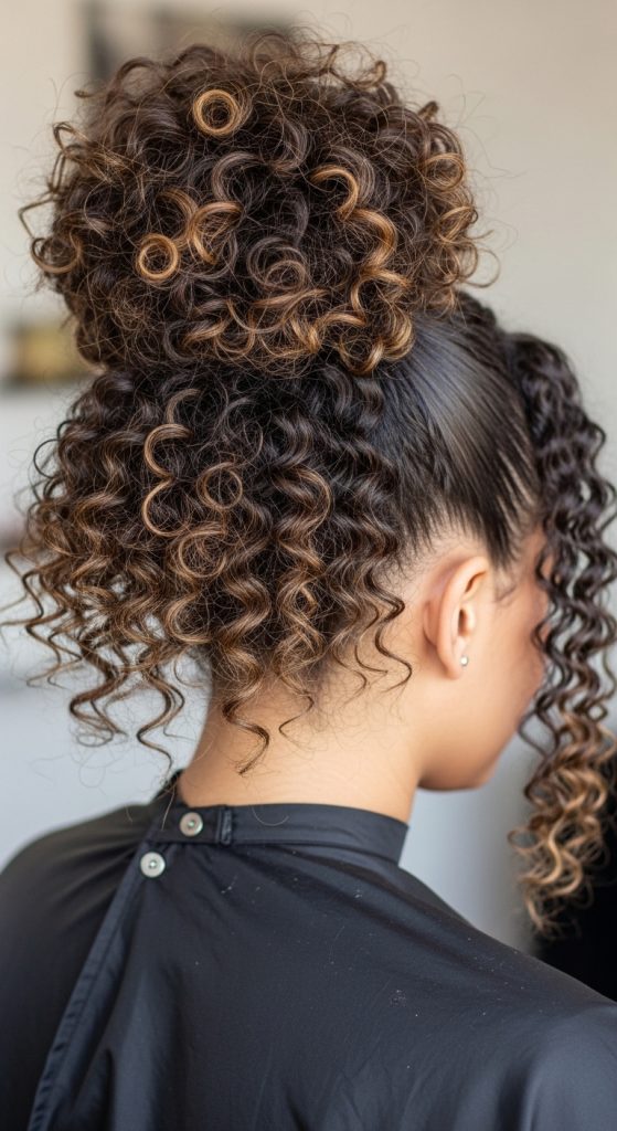 Hair is gathered into a high puff using a band, allowing curls to form a round, voluminous shape.