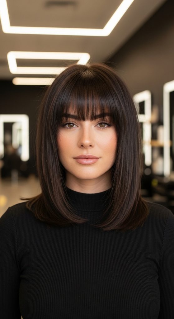 Micro bangs add a high-fashion edge. This look pairs short fringe with layered bob length.
