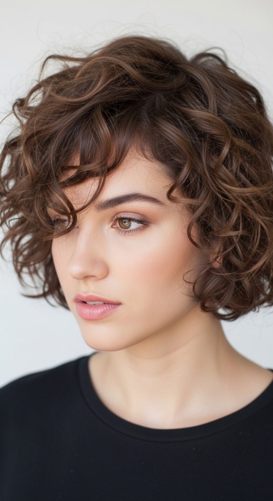 Adding soft bangs to short curly hair creates a delicate frame for the face. Pair with a short layered cut for best results.
