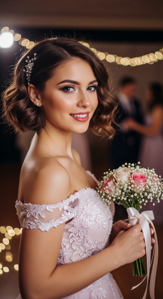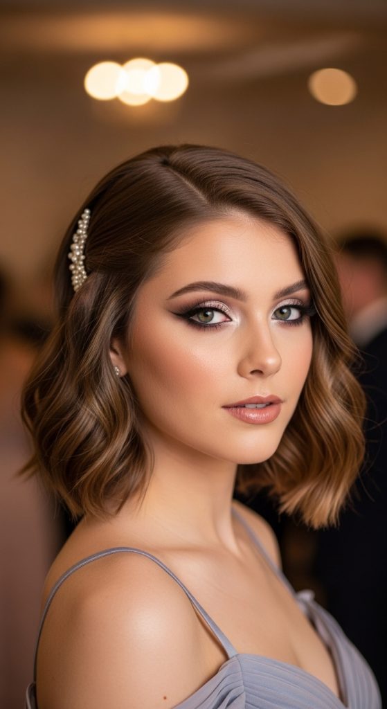 Accessories play a huge role—pearl clips, crystal pins, and delicate headbands instantly elevate short hairstyles into prom-ready looks.