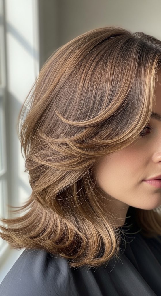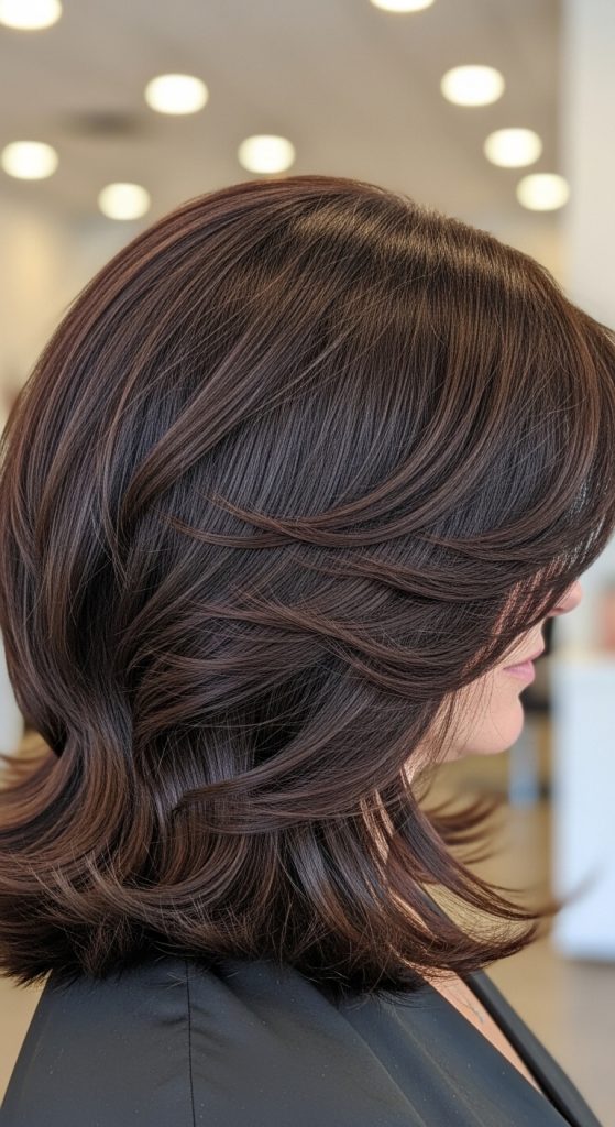 Adding balayage enhances dimension. Lighter pieces highlight the layered movement beautifully.