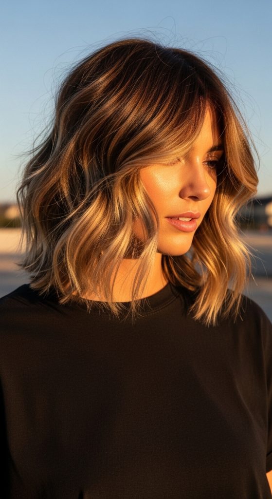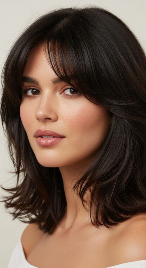 The key to this version is balance. The bangs should be airy, not thick or blunt. Layers should start around chin length and gradually cascade downward, creating movement without removing too much density. This style works beautifully on wavy and slightly textured hair but can also be styled with a curling iron for added definition.