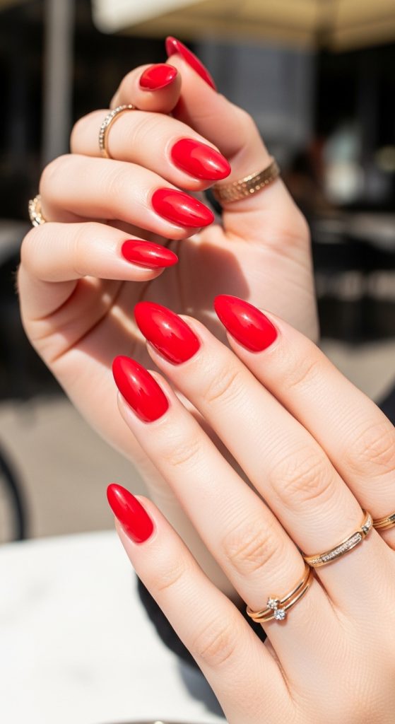 Cherry red is bold, classic, and incredibly flattering on pale skin. The high contrast between vibrant red and fair complexion creates a timeless, confident look. It enhances pink undertones without making the skin appear washed out.