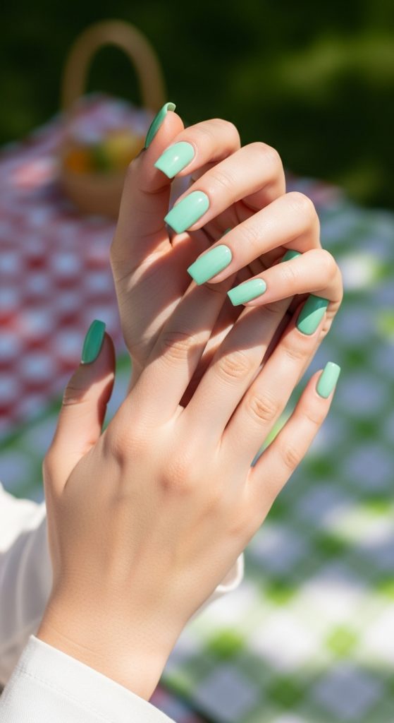 Mint green feels refreshing and summery. It looks crisp and clean against pale skin.