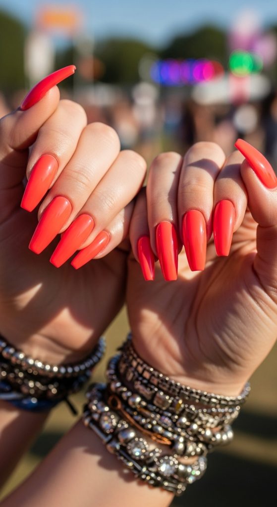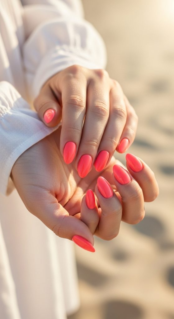 Coral peach is softer than neon orange but brighter than nude. It brings warmth to pale skin and creates a fresh summer vibe.