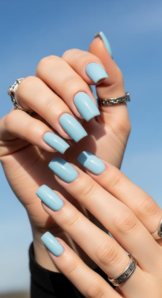 Sky blue creates a dreamy, playful summer contrast on pale skin. It’s bright but soft enough to remain wearable.