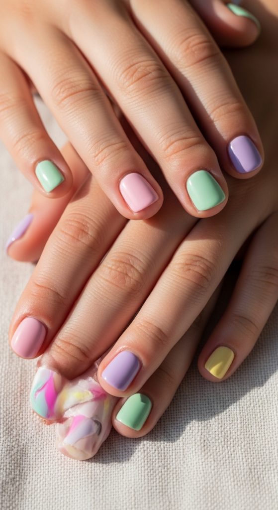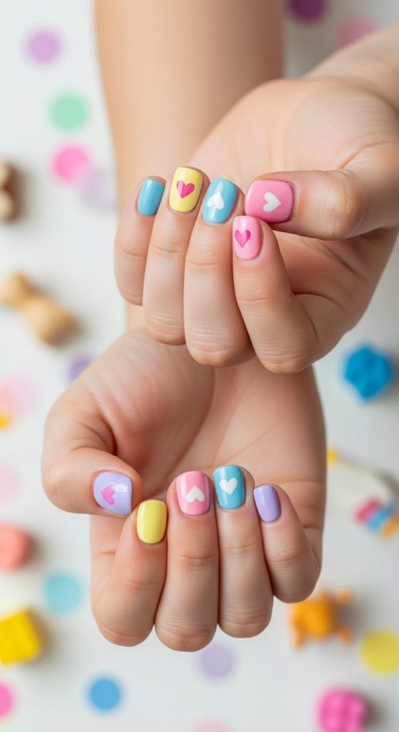 Mixed color nails allow kids to choose multiple favorite shades. This look is playful and expressive.