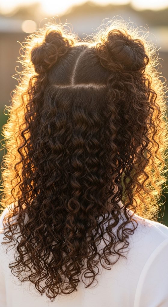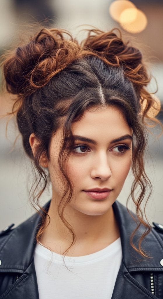 Messy curly buns are all about natural beauty and effortless styling. The curls are loosely gathered into two buns without trying to make them perfect.