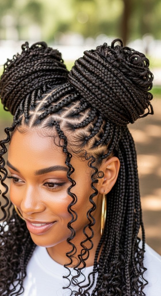 The mix of braids and curls adds texture and detail, making the style more unique.