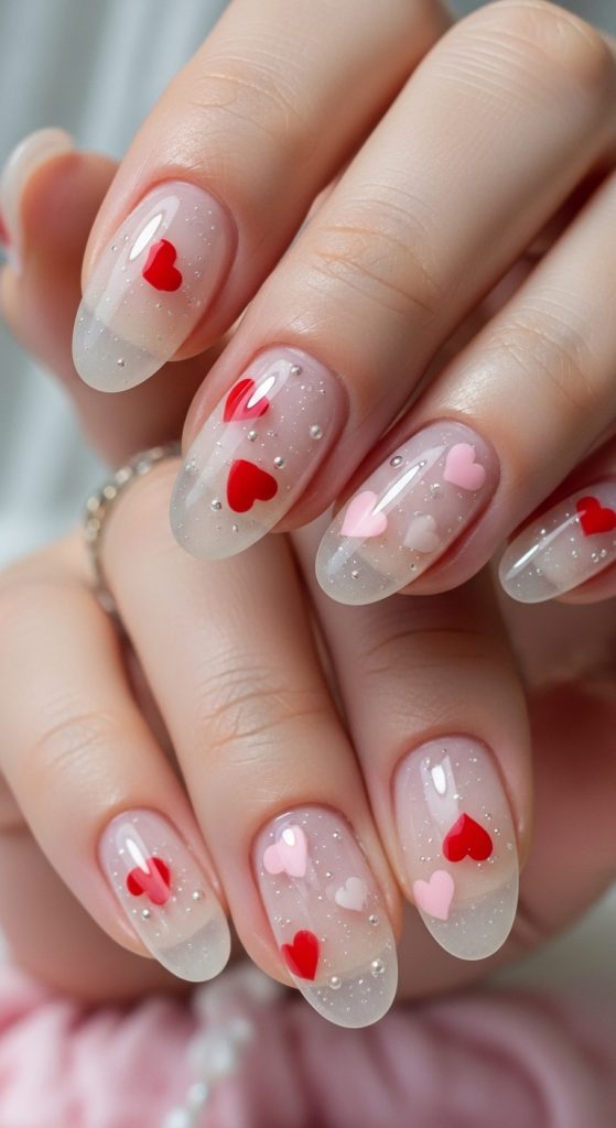 Clear or sheer nails are a big trend and they work beautifully for Valentines Day. This design features a transparent or milky base with tiny floating hearts placed strategically on one or two nails.