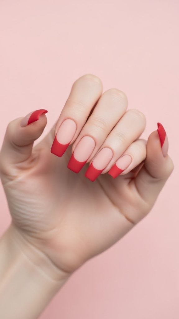 For a modern twist on the classic French tip, try a matte finish. Nude or pale pink nails with matte red or pink tips create a sophisticated and contemporary look. This design is perfect for those who prefer understated elegance over glossy glam.