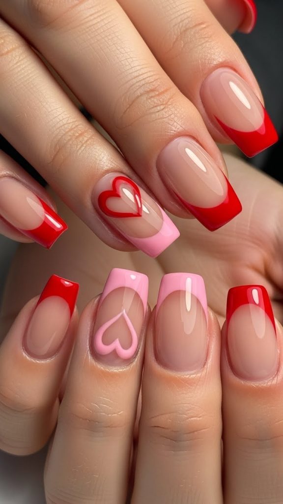 For those who want to fully embrace the Valentine’s theme, adding heart accents to your French tips is a fun idea. Keep the base nude or pale pink, paint your tips in red or white, and then add tiny heart shapes at the corner of each nail.